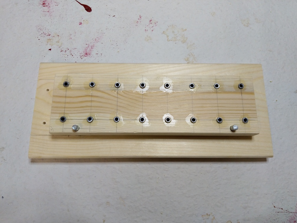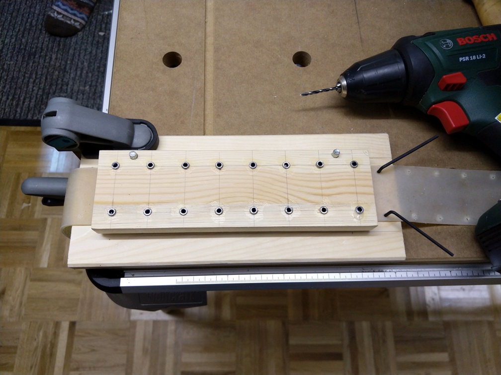 Da wir bereits den Schildrand für die Rohhaut gebohrt haben, müssen wir noch die Rohhaut löchern. Wir wollen sie ebenfalls mit einem 3mm Holzbohrer bohren. Dafür fertigen wir uns eine Bohrschablone an. Die Hülsen bestehen auch hier aus Stahl mit einem Außendurchmesser von 6mm und einem Innendurchmesser von 3,5mm. Der Abstand von Hülse zu Hülse beträgt 28mm in Längs- und 40mm in Querrichtung. Da die nasse Rohhaut eine Breite von ca. 50mm hat, sind die beiden Führungsstifte der Schablone so angebracht, dass die beiden Lochreihen mittig über der Rohhaut liegen. Nun bohren wir alle Löcher. Dann ziehen wir die Rohhaut entlang der Schablone, bis die letzten Löcher über den Referenzlöchern außerhalb der Schablone liegen. Dort fixieren wir die Rohhaut mit passenden Stiften (auf dem Bild sieht man zwei Sechskantschlüssel dafür) und bohren die nächsten Löcher, bis die gesamte Rohhaut gebohrt ist. Für unser 70cm Schild brauchen wir inkl. Verschnitt etwas weniger als 3m Rohhaut.