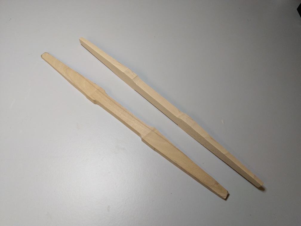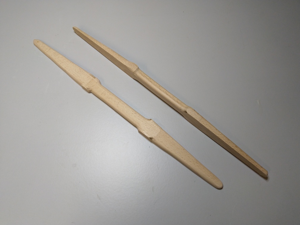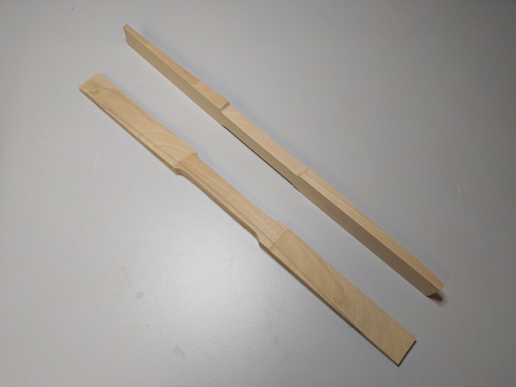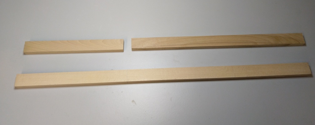 Die Leiste ist zu lang für unser Schild und muss deswegen auf das richtige Maß von 600mm gekürzt werden. Dann sägen wir von den Enden des Stabes ca. 10mm von der Dicke schräg zur Mitte hin ca. 200mm ein, sodass hier der Stab zu den Enden verjüngt ist.