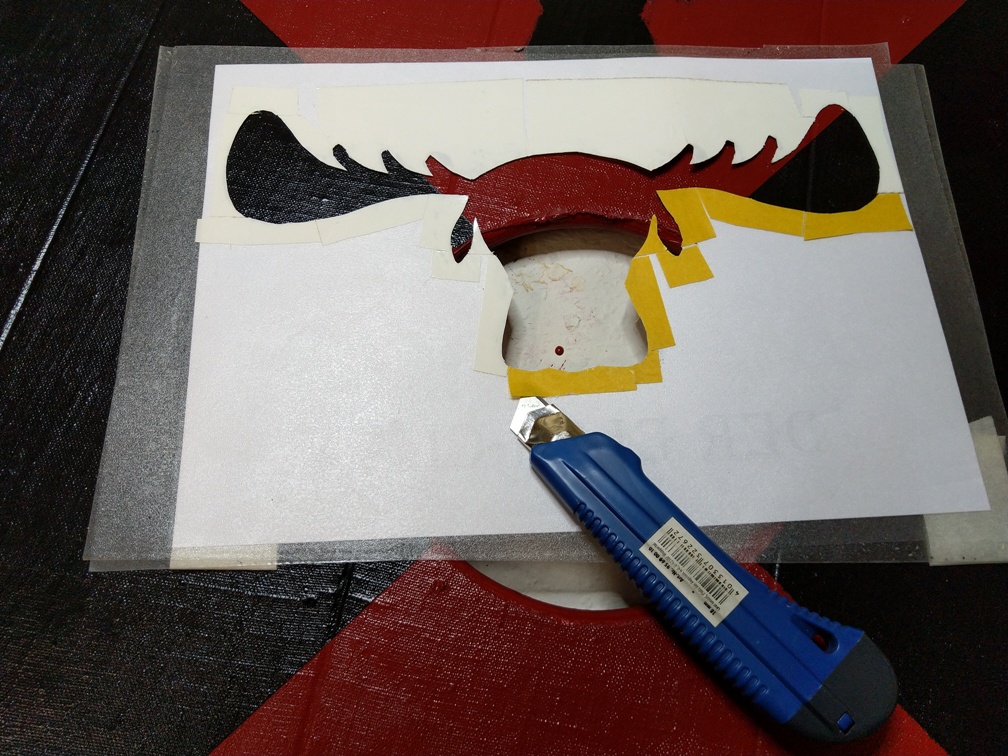 Trotz des Klebebandes kann es sein, dass etwas von der schwarzen Farbe unter die Schablone läuft. Das ist nicht nur ärgerlich, sondern unnötig und kostet extra Aufwand. Das lässt sich sehr einfach vermeiden. Nachdem die Schablone aufgelegt und festgedrückt ist, benutzen wir die Grundfarbe (bei uns hier Rot) und malen damit die Konturen der Schablone nach. Dort, wo die Schablone nicht perfekt aufliegt, läuft die Grundfarbe unter die Schablone und „dichtet“ diese ab. Das sieht man später aber nicht, da es ja die Grundfarbe ist. Wenn die Grundfarbe getrocknet ist, kann mit der eigentlichen Farbe (bei uns Schwarz) die Schablone ausgemalt werden.
