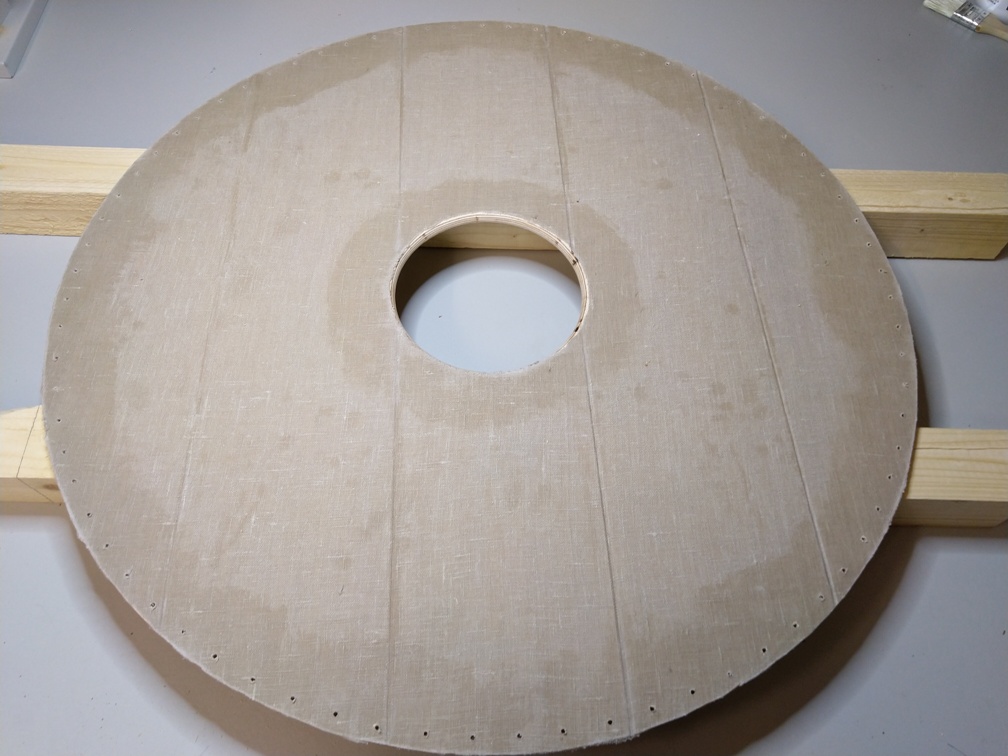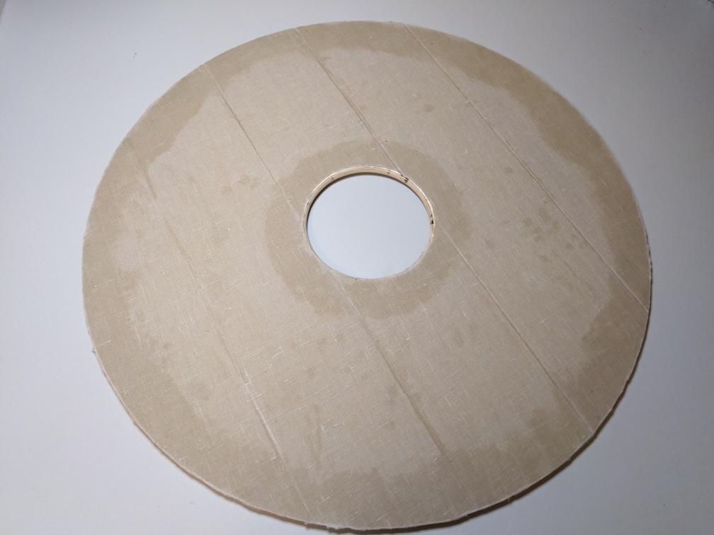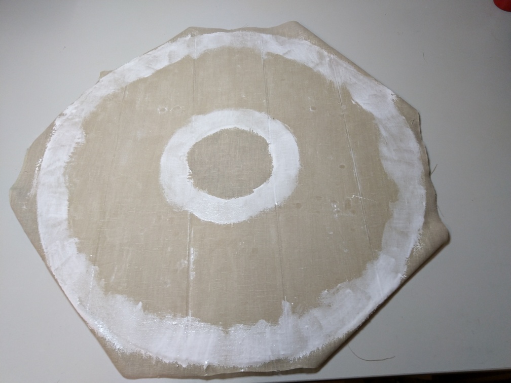 Zur Verstärkung des Schildes wird auf die Außenseite ein Leinentuch geklebt. Damit splittert das Schild nicht sofort bei einem Showkampf, wenn jemand mit der Axt oder dem Schwert darauf schlägt. Das Leinentuch bekommt man recht günstig beim großen schwedischen Möbelhaus meterweise.