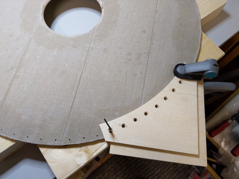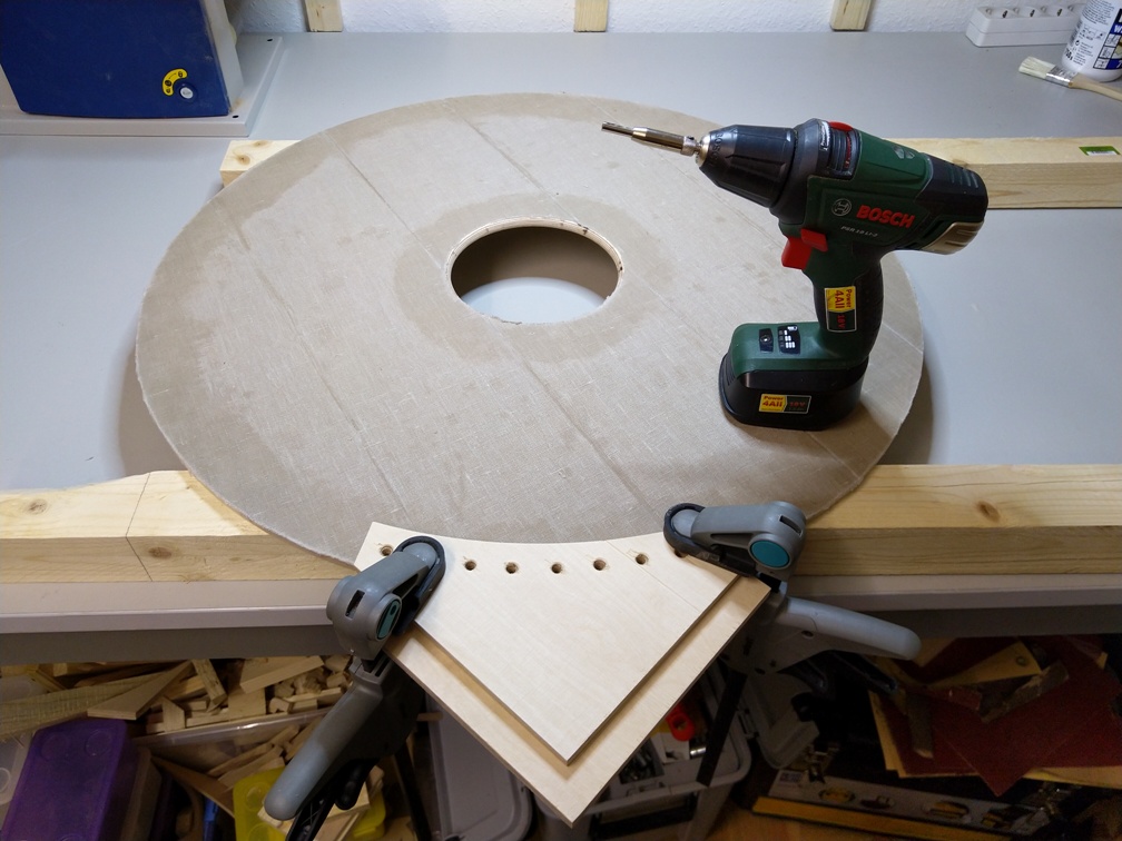 Nachdem nun klar ist, dass der Rest am Rand der Rohhaut genug halt gibt können wir weiter machen. Wir brauchen noch den Lochabstand von Loch zu Loch, wenn wir alle 5° ein Loch setzen möchten. Das ergibt einen nun einen Abstand von ~28mm, den wir messtechnisch ermittelt haben. Damit wir nicht alle 72 Löcher einzeln ausmessen und anzeichnen müssen, haben wir uns aus den Resten der Grundplatte eine Bohrschablone gebaut. Diese passt genau für die 70cm Schilde.