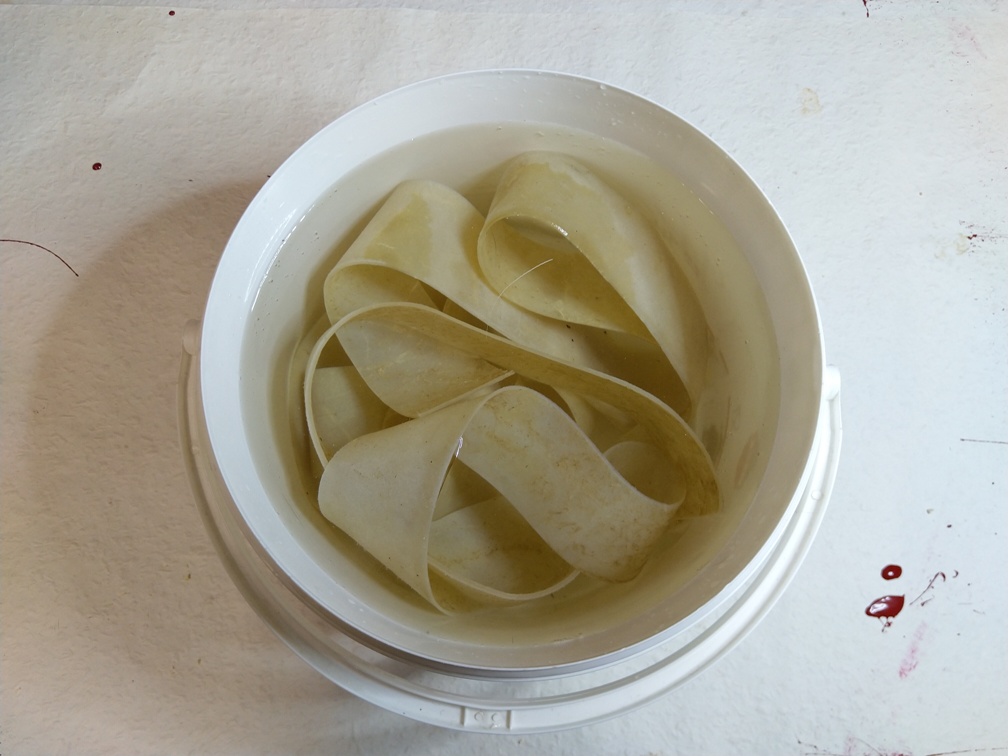 Die Haut bleibt mindestens für 24h im Wasser. Dabei nimmt sie viel Flüssigkeit auf und wird dadurch wieder schön flexibel. Gleichzeitig wird sie durch die Aufnahme des Wassers noch größer. Die Hautstreifen haben eine Breite von ca. 45mm im getrockneten Zustand und ca. 50mm im gewässertem. Wir kommen weiter unten noch im Detail dazu, was deswegen beim Umgang mit der Rohhaut zu beachten ist.
