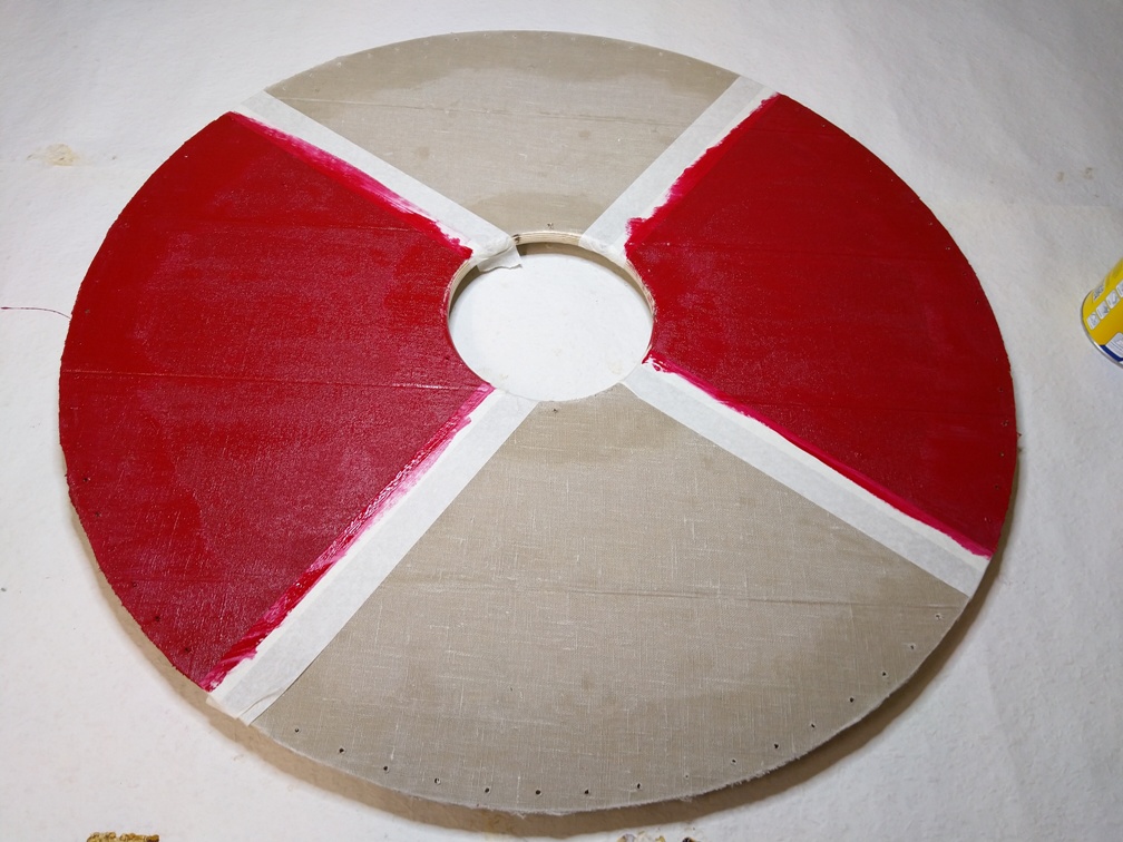 Nach dem Abkleben der Viertel können wir mit einer Farbe anfangen. Wir starten hier mit Rot, da später noch unser Elch in Schwarz hier draufkommt. Wenn die rote Farbe nach ca. 12h getrocknet ist, können wir die Klebestreifen entfernen und neue auf die roten Viertel kleben, damit wir eine saubere Kante für das Schwarz bekommen.