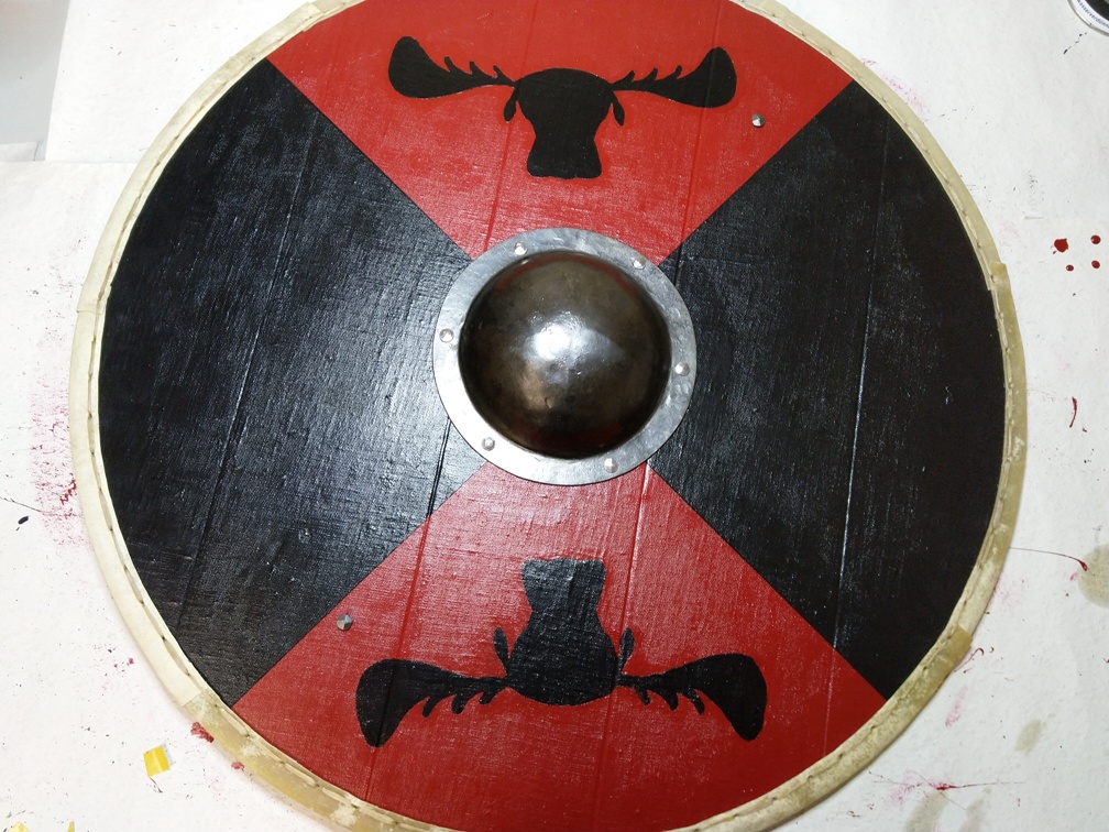 Nun ist es fast geschafft. Unser Schild ist bemalt und hat auch die Elche drauf. Der Schildrand ist mit dem Hanfseil und der Rohhaut geschützt. Was fehlt noch? Klar, der Schildbuckel, der Holzgriff und der Trageriemen, um das Schild auf dem Rücken zu tragen. Der Schildbuckel wird klassisch mit geschmiedeten Nägeln befestigt. Die langen Nägel werden auf der Rückseite des Schildes umgebogen und die Spitzen wieder in das Schildholz getrieben. Zwei gegenüberliegende Löcher vom Schildbuckel werden auch noch zur Befestigung des Holzgriffes genutzt. Das spart zwei Nägel. Den Trageriemen (aus Echtleder) befestigen wir ebenfalls zusammen mit dem Holzgriff. Dazu nehmen wir die Enden des Griffes und lange Nägel (60mm), die wir in einem Bogen auf der Rückseite umbiegen. Nur die Spitze der Nägel werden im Griff versenkt. Der Griff, sowie der Trageriemen sind so angebracht, dass unser Elch Logo richtig zu sehen ist, wenn wir das Schild auf dem Rücken haben.