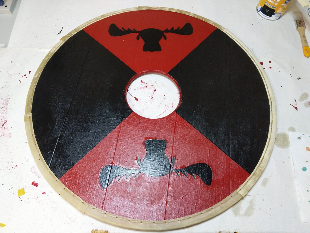 Wie man auf den Bildern erkennen kann haben wir vor dem Aufmalen des Elches das Hanfseil und die Rohhaut am Schildrand angenäht. Beim zweiten Schild haben wir erst die Bemalung abgeschlossen, bevor wir den Schildrand gemacht haben. Es ist im Prinzip egal wann man die Rohhaut anbringt. Es sollte jedoch erst gemacht werden, wenn das Schild am Rand bemalt ist. Sonst fehlt hier später der Holzschutz.