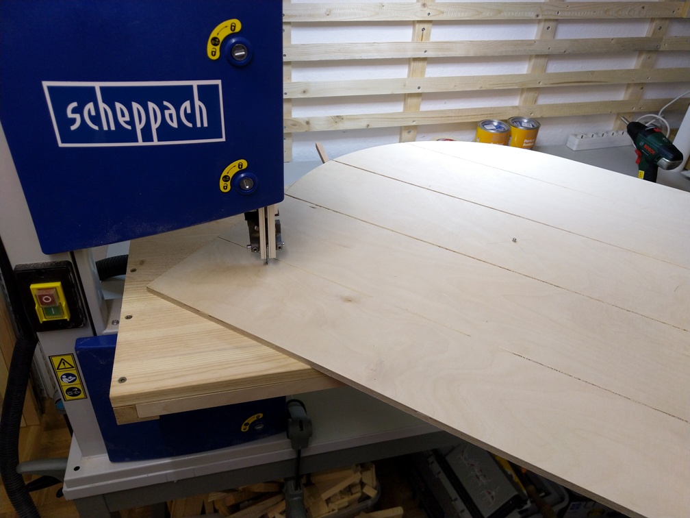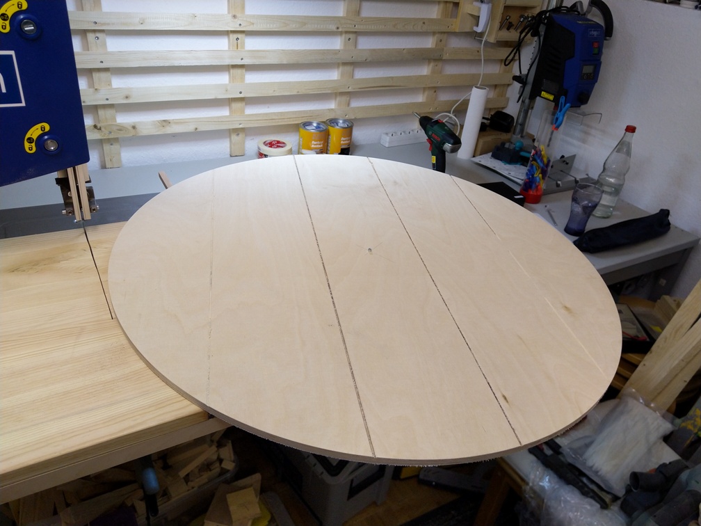 Wir nehmen unsere Bandsäge mit einer einfachen Kreisschablone. Es gibt Zahlreiche Videos im Internet, wie man sich selbst eine Schablone bauen kann und wie sie benutzt wird. Deswegen gehe ich hier nicht darauf ein. Wir haben uns eine ganz einfache Schablone erstellt. Im Abstand von 350mm zum Sägeblatt haben wir ein Loch von 5mm Durchmesser gebohrt und einen Metall-Pin von gleichem Durchmesser eingesteckt. Auf den Pin wird dann die Platte des Schildrohlings gesteckt. Die Bandsäge wird gestartet und die Kreisschablone mit dem Schildrohling wird bis zum Anschlag vorgeschoben. Nun sind das Mittelloch des Rohlings und das Sägeblatt genau auf dem Durchmesser des Schildes. Dann drehen wir den Rohling langsam im Uhrzeigersinn. Am Ende haben wir einen perfekten Kreis aus dem Rohling gesägt.