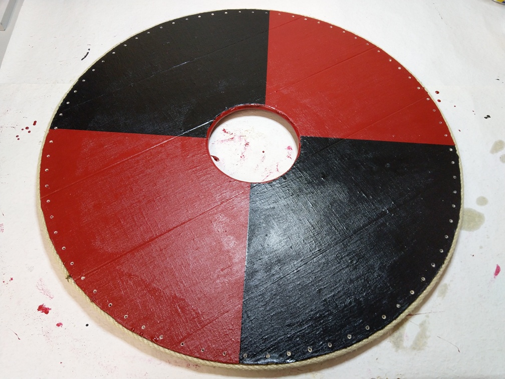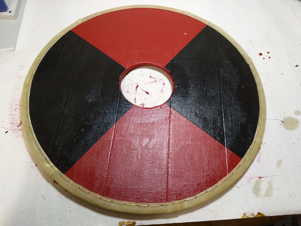 Jetzt können wir uns an die Bemalung des Schildes machen. Unser erstes Schild soll in Viertel aufgeteilt werden, wobei die gegenüber liegenden Viertel die gleiche Farbe haben sollen. Da unsere Stammesfarben Dunkelrot und Dunkelbraun/Schwarz sind, soll dieses auch bei den Schilden der Fall sein.