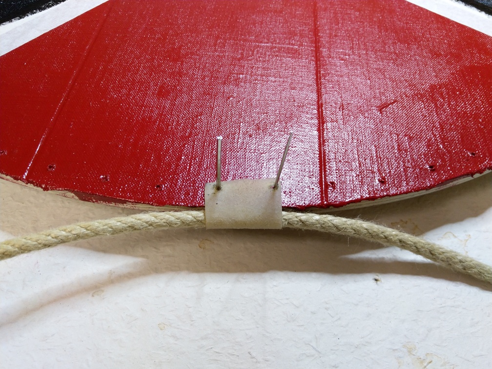 Die Rohhaut, die später den Rand des Schildes schützen soll, wird bei unseren Schilden vernäht und nicht genagelt. Da die Nadel nicht ohne weiteres durch das Holz kommt, müssen wir die Löcher bereits vor dem Vernähen bohren. Wir wollen alle 5° ein Loch setzen, was 10mm vom Außenrand entfernt liegt. Warum nur 10mm? Das liegt an der Breite der Rohhaut. Wie bereits oben erwähnt, ist die Rohhaut im gewässerten Zustand ca. 50mm breit. Auf dem Außenrand des Schildes wird noch ein Hanfseil von 8mm Stärke aufgebracht und später mit der Rohhaut umspannt. Dadurch wird der Schildrand flexibel und ist dadurch Widerstandsfester gegen Schwerthiebe. Wenn die Rohhaut ¾ um das Seil gelegt wird, dann entspricht das ungefähr einer Länge von 20mm (vereinfacht betrachtet und gerundet). Dann bleiben noch ~30mm übrig. Wenn wir die Nahtlöcher nun 10mm vom Außenrand legen, dann bleibt ein Rest von ~5mm an jeder Seite der Rohhaut. Hier mal ein Bild eines Tests, ob denn dieser Rest ausreicht, um sicher die Rohhaut zu halten.