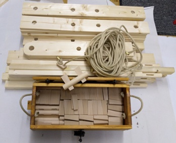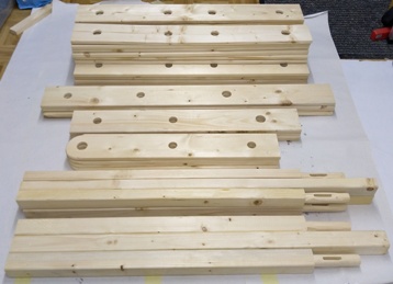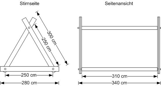 Nun zum Gestell. Die Maße lehnen sich an den Maßen an, die im Aufbauplan zur Zeltplane stehen. Hier mal eine Skizze davon. Da wir alles im normalen PKW transportieren wollen, können wir keine Bretter oder Balken nehmen, die 250cm oder gar 340cm lang sind. Also müssen die langen Bretter in kleinere Bretter zerlegt werden. Da wir gute Erfahrungen mit der Keiltechnik bei unserem ersten Steckbett gemacht haben, war schnell klar die gleiche Technik auch beim Zelt zu verwenden. Ein Nachteil bei dieser Art des Aufbaus ist der Mehrbedarf an kleineren Brettern, um die Stabilität zu erreichen. Somit besteht jedes „Brett“ der Zelt Vorder- und Rückseite aus 7 einzelnen Brettern. Hier mal ein Bild vom ersten zusammen stecken eines Brettes mit den Bolzen, um zu schauen, ob alles passt und wie stabil die Konstruktion schon ohne Keile ist.